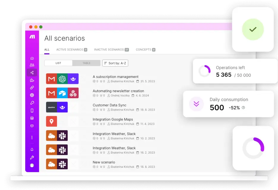 With Make you can improve business efficiency by integrating complex systems and applications and automating workflows in one place. You can also get the most out of your process automation with improved observability and analytics.