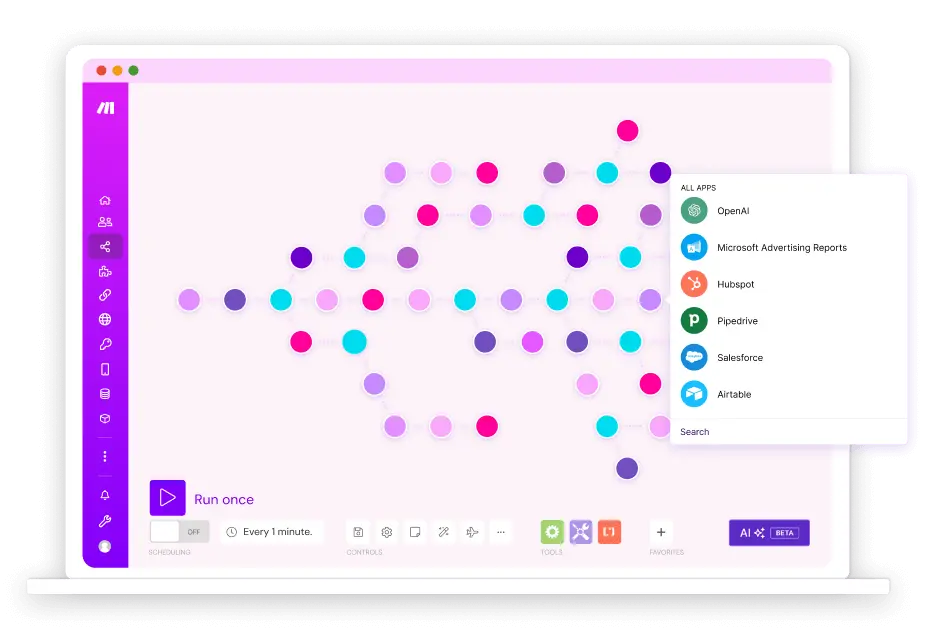 AI is transforming the way we work. Make accelerates this process, with 400+ pre-built integrations with AI apps. Make AI Agents open up even more possibilities, with automation that thinks and acts in the moment.